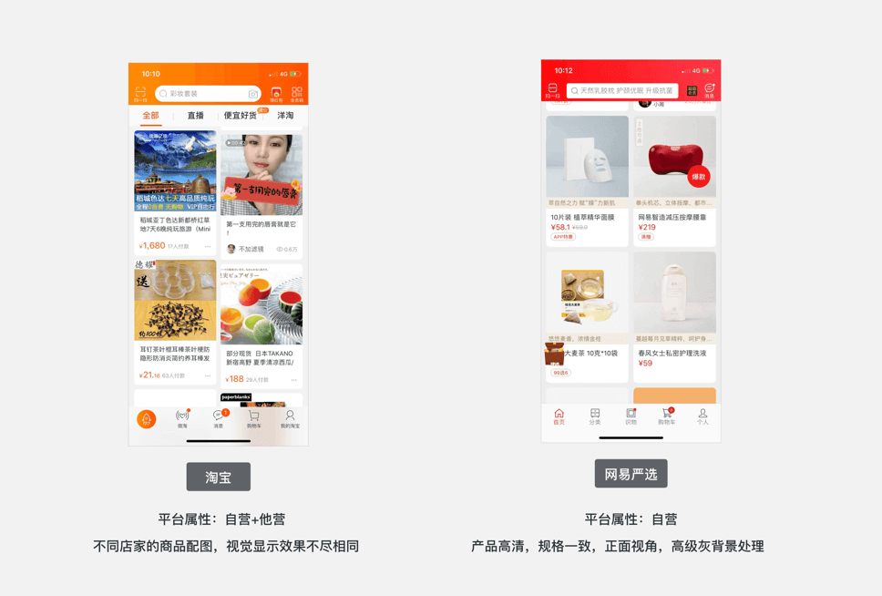 在构思UI页面阶段,首先需要了解以下两个问题:1.图片区域占比问题;2.图片来源问题。当页面图片占比多,且让用户自定义,那么需要预估到APP上线后设计可控率会降低。换句话说,实际上线效果会不尽人意。如下图:由于淘宝和网易严选平台属性不同,在图片品控上就有着不同的视觉感受。当然,不是说淘宝做的不好,而是当一个平台集纳不同的店铺,不同调性的产品类型,即使有图片规范,也难如统一品类、调性的产品来的统一。